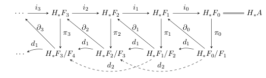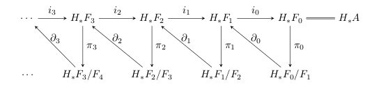 This diagram as drawn is no longer commutative, so you’ll have to keep aware of that. Instead, each of these triangles is exact in the usual sense that at each node, the image of one map is equal to the kernel of the next. Now, keep in mind our goal: we’re supposed to be reconstructing from these filtration quotients . There are two clear problems with looking at the homology of the filtration quotients: